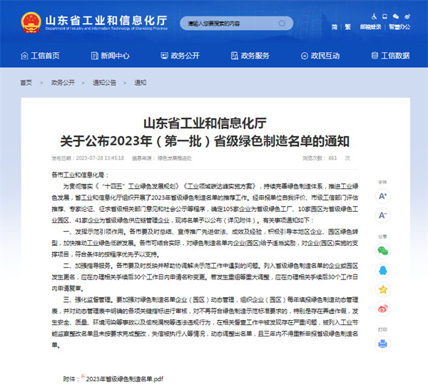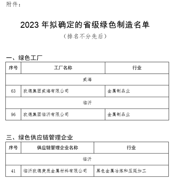 7月28日,山東省工業和信息化廳公布了2023年(第一批)省級綠色制造名單。玫德集團3家企業入選,其中玫德集團威海有限公司、玫德集團臨沂有限公司被評為為山東省綠色工廠,臨沂玫德庚辰金屬材料有限公司被評為山東省綠色供應鏈管理企業。
