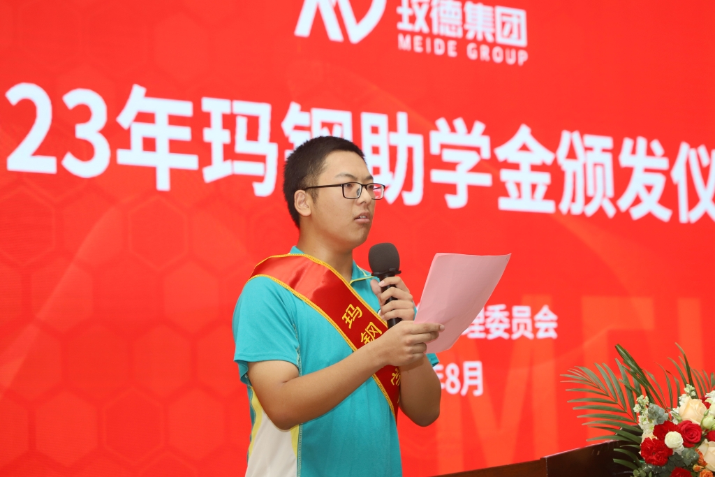 考入臨沂大學的濟南市工業學校學生代表李衍果發言,他表達了對玫德集團,瑪鋼助學基金管委會,對母校、老師們崇高的敬意和衷心的感謝,并表示要保有一顆感恩的心回報家鄉,成長于社會,定要回饋于社會。