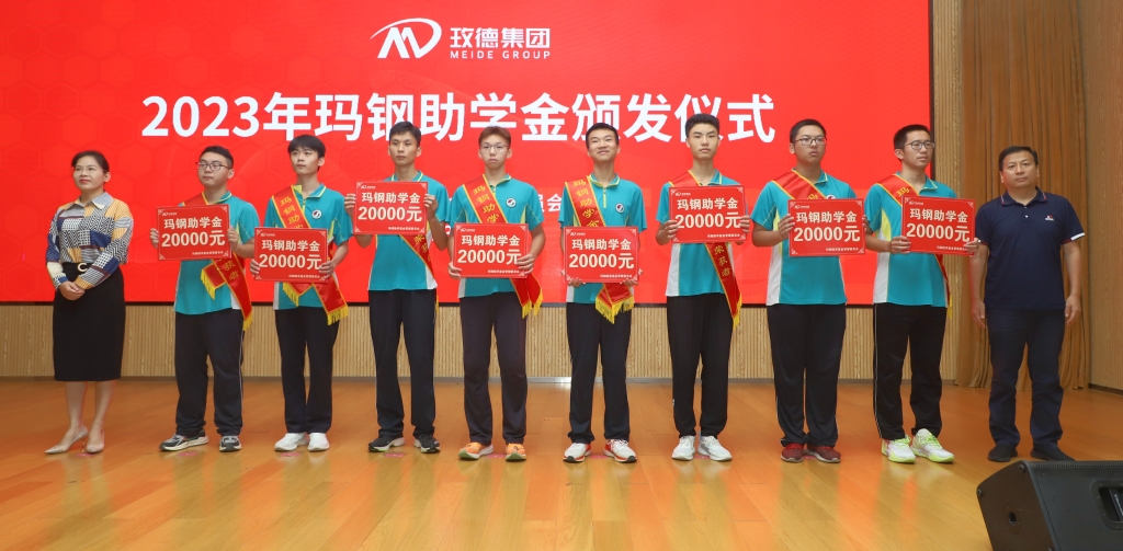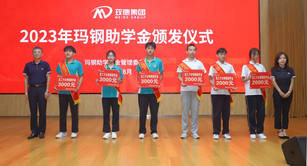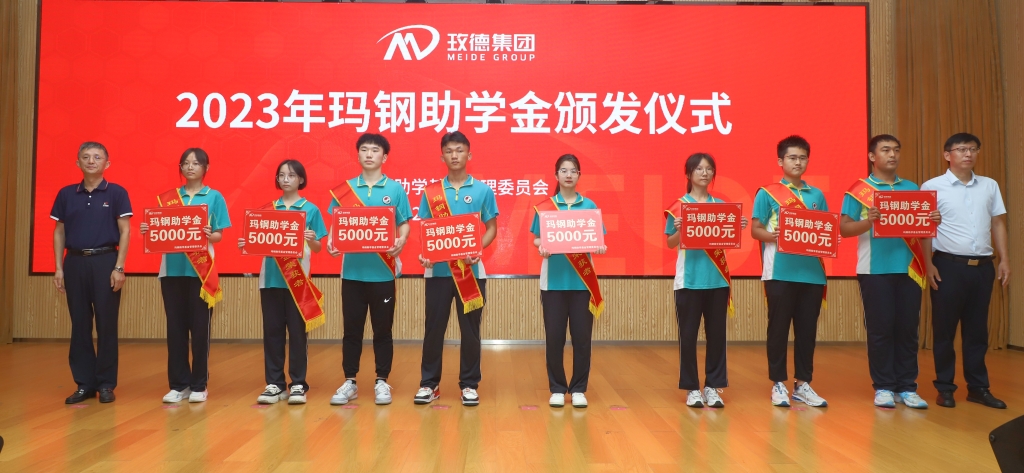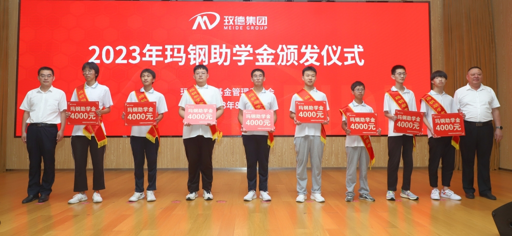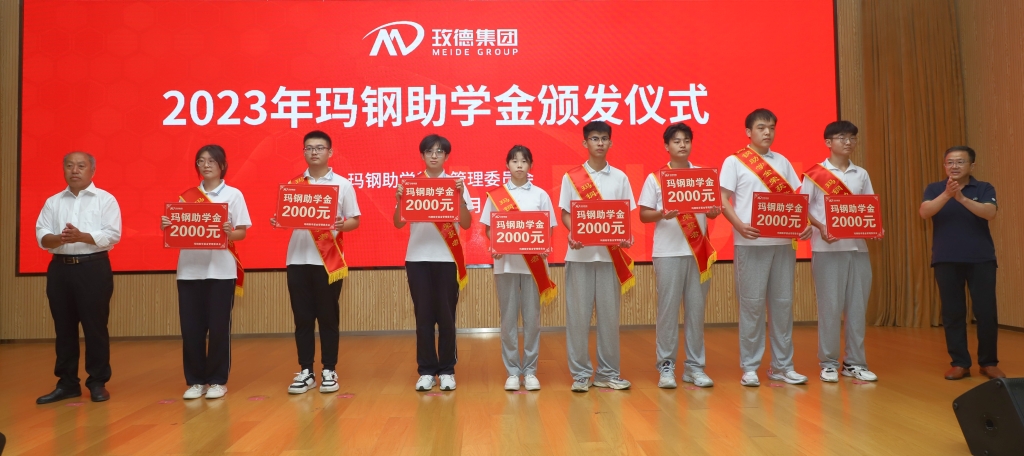 8月15日上午,2023年瑪鋼助學金頒發儀式在玫德集團科技園隆重舉行。171名優秀高三畢業生榮獲共計72.1萬元瑪鋼助學金,90名高三年級優秀任課教師榮獲31.92萬元瑪鋼助學金。玫德集團為7名員工子女發放特別助學獎勵1.8萬元。