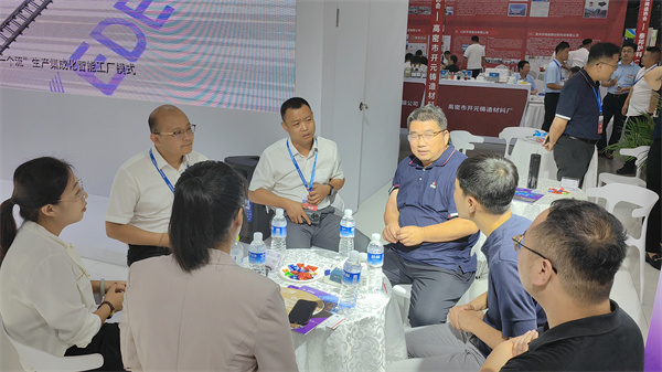 玫德集團董事局副主席李傳軍,濟南科德智能科技有限公司總裁劉少云,玫德庚辰金屬材料有限公司總裁張志義,濟南科德智能科技有限公司高級副總裁張明一、劉璐在展會現場指導工作并與客戶深入交流。