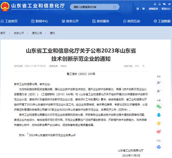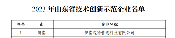 2023年11月6日,山東省工信廳網站公布了《山東省工業和信息化廳關于公布2023年山東省技術創新示范企業的通知》。經企業自愿申報、有關單位推薦、專家論證和公示等程序,認定濟南邁科管道科技有限公司等107家企業為2023年山東省技術創新示范企業,名單現予公布。