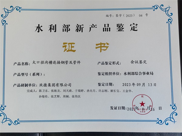 11.9月13日,玫德集團(tuán)有限公司自主研制的“大口徑溝槽鋼管及管件”,通過(guò)水利部及行業(yè)專家鑒定,產(chǎn)品加工技術(shù)及能力達(dá)到國(guó)際領(lǐng)先水平,產(chǎn)品達(dá)到國(guó)際先進(jìn)水平,開創(chuàng)了大口徑埋地鋼管溝槽連接的先河。