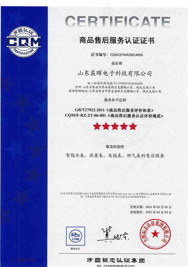 2024年3月25日,玫德集團(tuán)旗下山東晨暉電子科技有限公司順利通過了商品售后服務(wù)認(rèn)證審核。山東晨暉的智能水表、熱量表、電能表、燃?xì)獗淼氖酆蠓?wù)水平已達(dá)到GB/T27922-2011《商品售后服務(wù)評價(jià)體系》及CQM/F-RZ-ZY-06-001《商品售后服務(wù)認(rèn)證評價(jià)規(guī)范》。