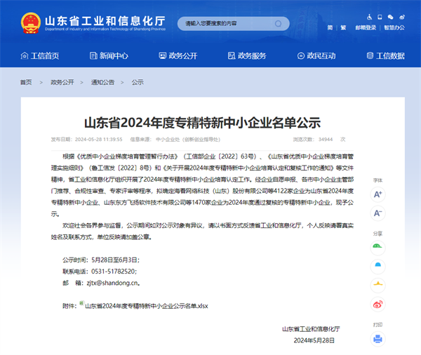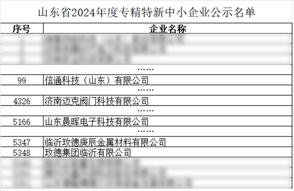 2024年5月28日山東省工業(yè)和信息化廳發(fā)布《山東省2024年度專精特新中小企業(yè)名單公示》通知,玫德集團(tuán)旗下濟(jì)南邁克閥門科技有限公司、山東晨暉電子科技有限公司、臨沂玫德庚辰金屬材料有限公司、玫德集團(tuán)臨沂有限公司順利通過2024年度山東省“專精特新”中小企業(yè)復(fù)核,玫德集團(tuán)旗下信通科技(山東)有限公司首次通過2024年度山東省“專精特新”中小企業(yè)認(rèn)定。