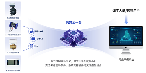 智能平衡閥與樓棟超聲波熱量表等產品組合輸出,組成智能水力平衡裝置。戶端智能平衡方案總體上由軟件平臺上的熱用戶監測調控系統、樓棟單元熱力入口處的智能水力平衡裝置、用戶室內的室溫采集器和數據傳輸的網絡設備組成。通過對客戶進行二網智能平衡改造和建設,實現居民小區管網二次水力平衡的自動化調節,釋放現場調節所需的人力、提高運行管理效率與服務水平,實現均衡輸配的低能耗、高質量的供熱模式。