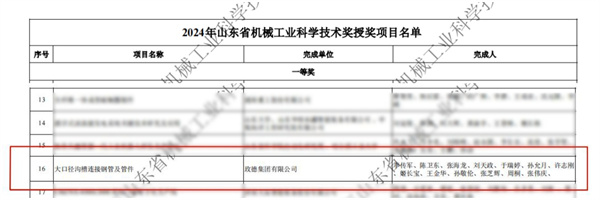 2024年09月08日,山東省機械工業科學技術協會網站下發了《關于公布2024年山東省機械工業科學技術獎的通知》,玫德集團有限公司提報的“大口徑溝槽連接鋼管及管件項目”榮獲山東省機械工業科學技術一等獎。